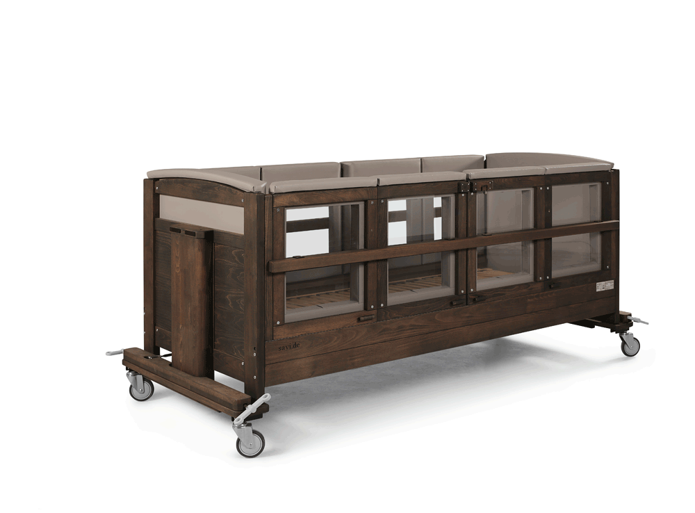 ChoReha (b) in Buche, Oberflächenfinish "Basalt", Liegefläche 100x220 cm, beidseitig Falttüren in der 270° Version abschließbar mit SAVI-Schloß III und neuer Türverriegelung "easy close", Seitengitterhöhe 64 cm, rundum feste Polsterung + Kantenpolsterung in creme, Liegehöhe 41-91 cm, Höhenverstellung elektrisch, Zentralfeststeller für Vierrollenfahrwerk mit Totalfeststeller (NEU)