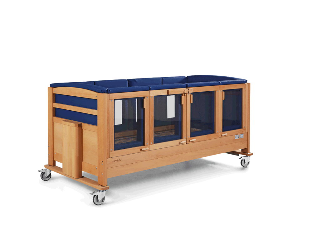 ChoReha (b) in Buche, Liegefläche 100x200 cm, Farbakzent natur, vierflügelige Falttür abschließbar mit SAVI-Schloss IV und neuer Türverriegelung "easy close", rundum feste Skai-Polsterung in blau, zusätzliche Kantenpolsterung der oberen Seitengitterkante, Liegehöhe 41-76 cm, Seitengitterhöhe 64 cm, Vierrollenfahrwerk mit Totalfeststeller aus Kunststoff
