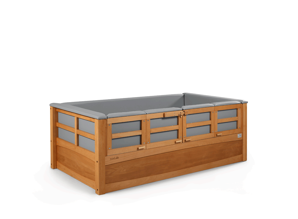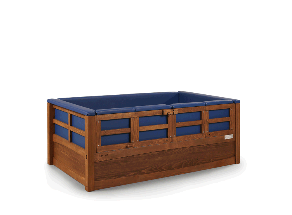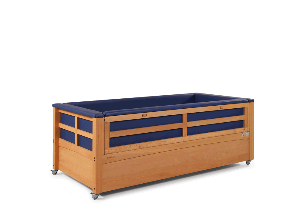 ChoReha (c) in Buche, Oberflächenfinish "Nussbaum", Liegefläche 100x200 cm, beidseitig vierflügelige Falttür abschließbar mit SAVI-Schloß III und neuer Türverriegelung "easy close", Liegehöhe 40-80 cm, Höhenverstellung elektrisch, rundum feste Polsterung + Kantenpolsterung in blau, Seitengitterhöhe 40 cm