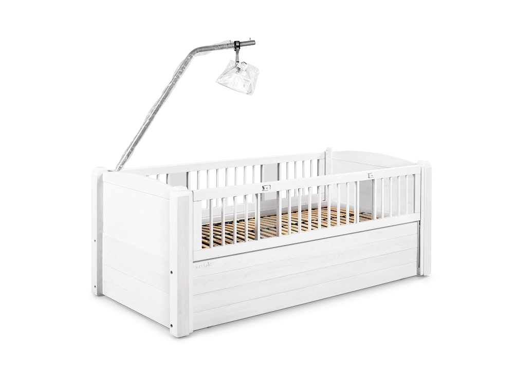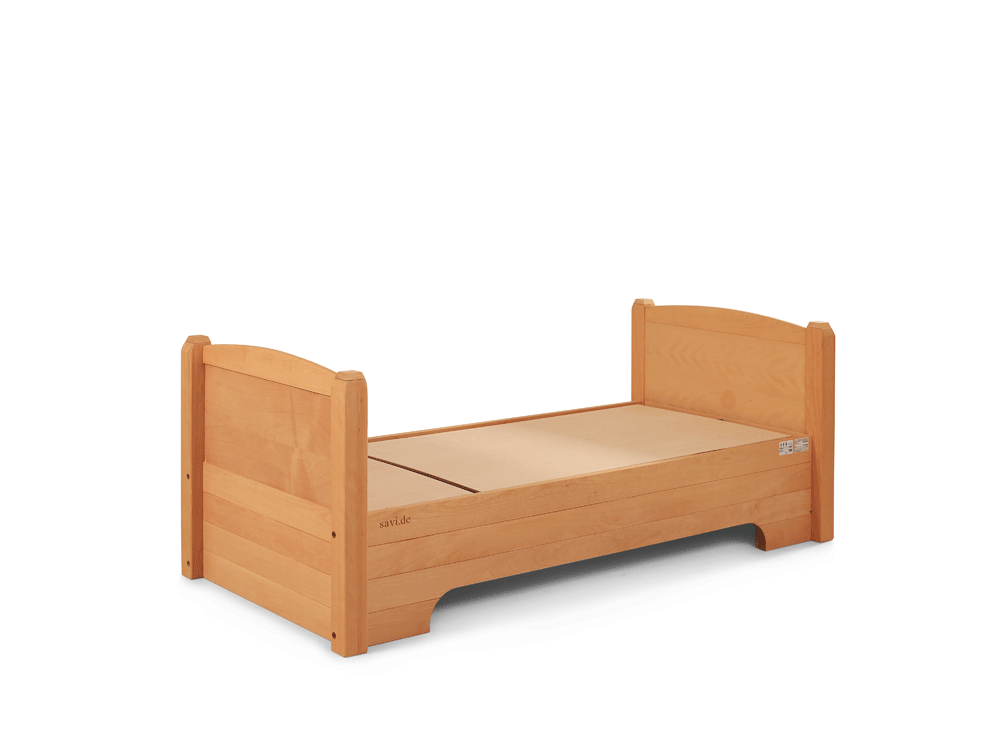 Pflegebett Si/Schwerlastbett in Buche natur, Liegefläche 120x200 cm, Ausschnitt von 15 cm in einer Längsseite für die Nutzung von einem Patientenlifter, 2 Längsseitengitter nach oben herausnehmbar, Höhenverstellung der Liegefläche elektrisch, Liegehöhe 40-80 cm, 4-Rollenfahrwerk (125 mm mit Zentralfeststeller, integriert)