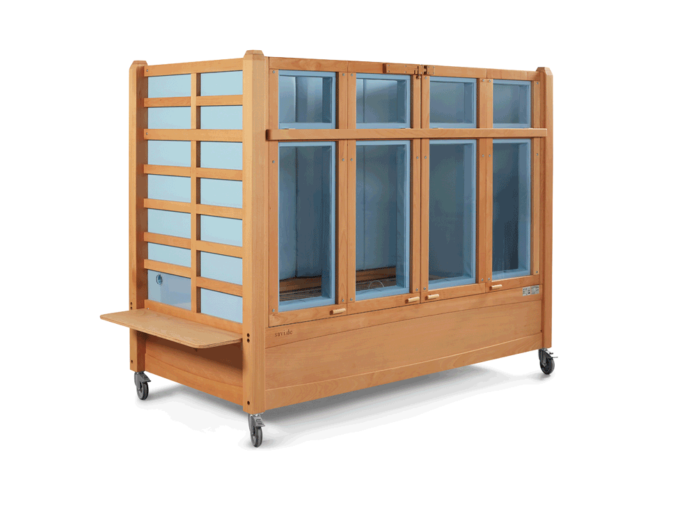 ChoReha (e) in beech, lying surface 90x200 cm, four-wing folding sliding doors on both sides, lockable with SAVI lock IV and external door security, fully integrated padding around the entire height, door front with vinyl windows, side rail height 120 cm, supply opening (hole), storage table for the ventilator