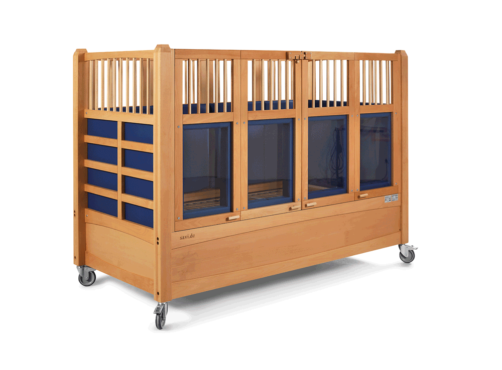 ChoReha (e) in beukenhout, ligoppervlak 90x200 cm, aan beide zijden viervleugelige vouwschuifdeuren afsluitbaar met SAVI-slot IV en externe deurbeveiliging, rondom vast geïntegreerde bekleding over de volledige hoogte, deurfront met vinylramen, hoogte zijhekken 120 cm, verzorgingsopening (gat), opbergtafel voor het beademingsapparaat